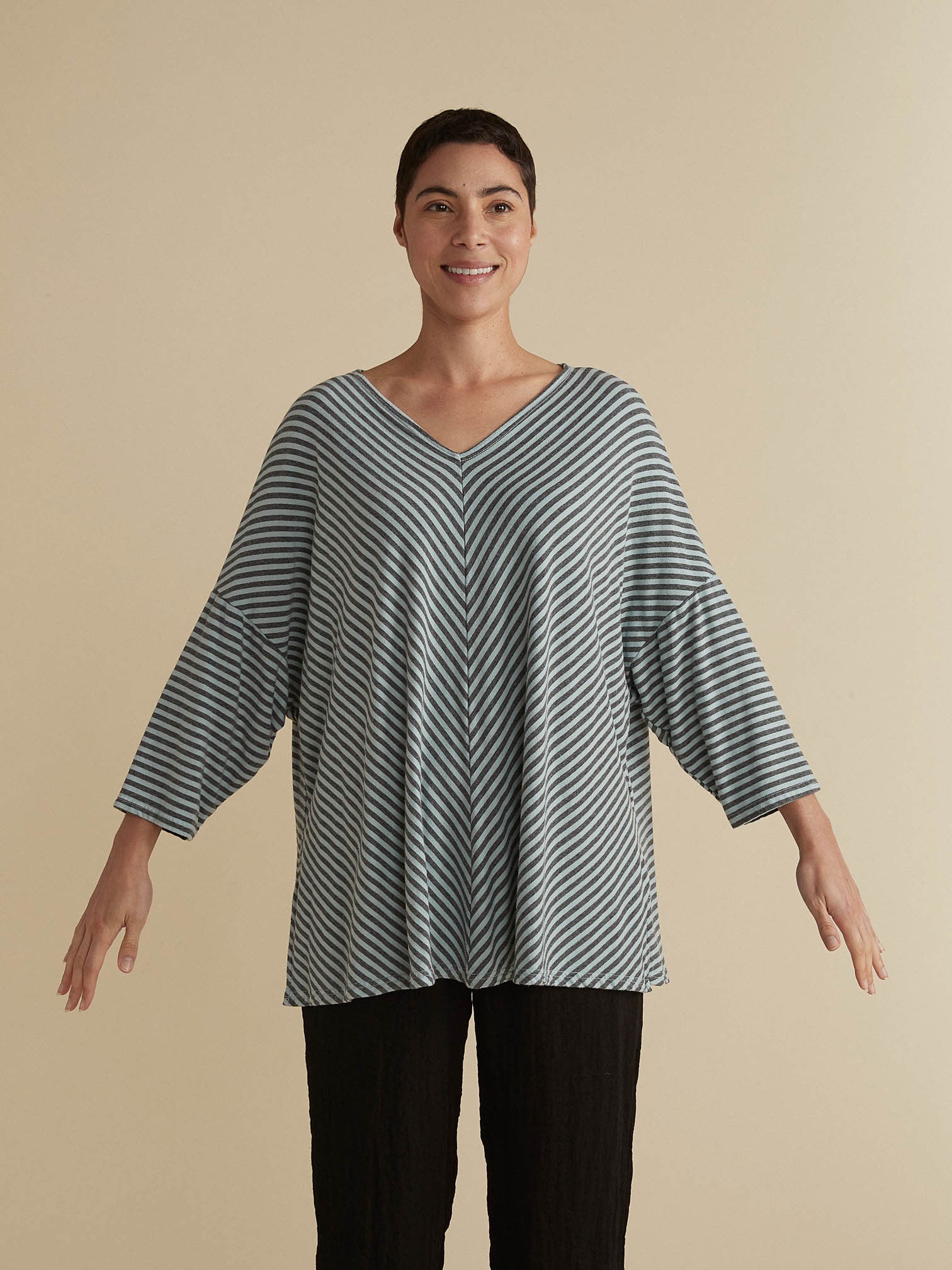 This stiped fleece one-size top from Cut Loose features a V-neck, drop shoulder 3/4 sleeve, seam detail and a relaxed fit. Made from soft fabric with stretch, this piece is sure to become a fall favorite.