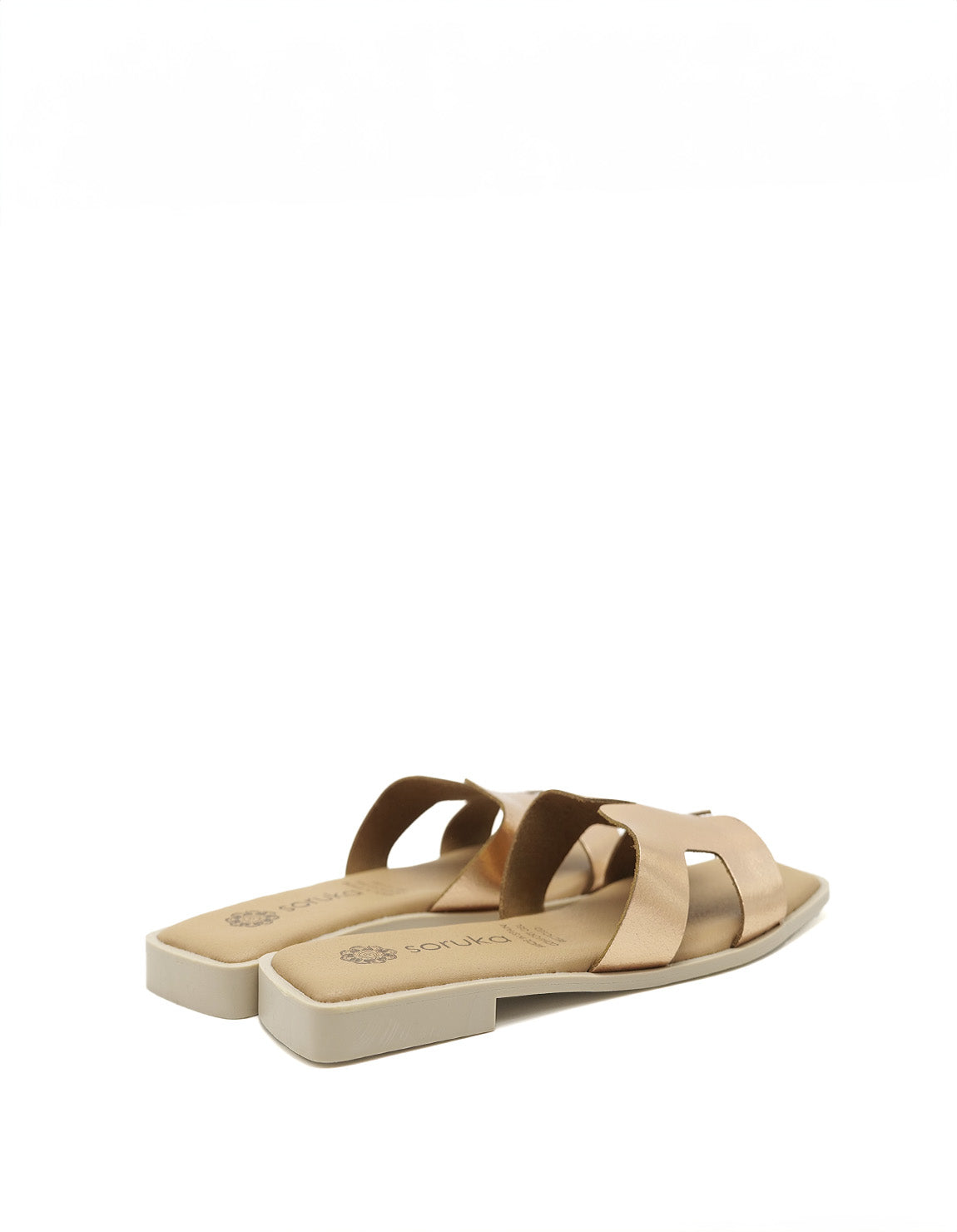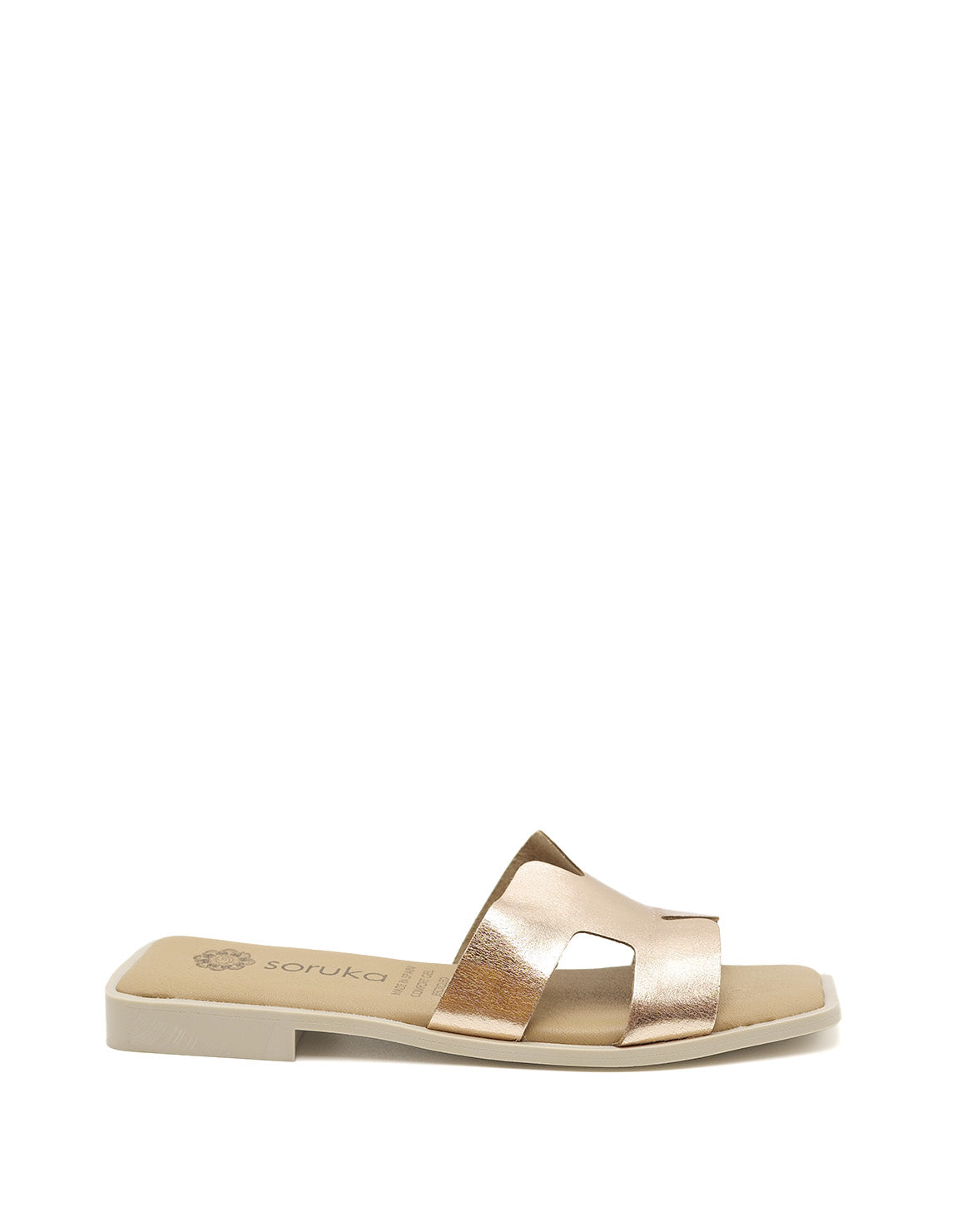 The Soruka DAPHNE Slides offer a refined blend of eco‑conscious craftsmanship and effortless style. Made from 100% recycled leather, these sandals deliver lightweight comfort, elegant simplicity, and a sleek metallic finish that elevates any warm‑weather outfit.