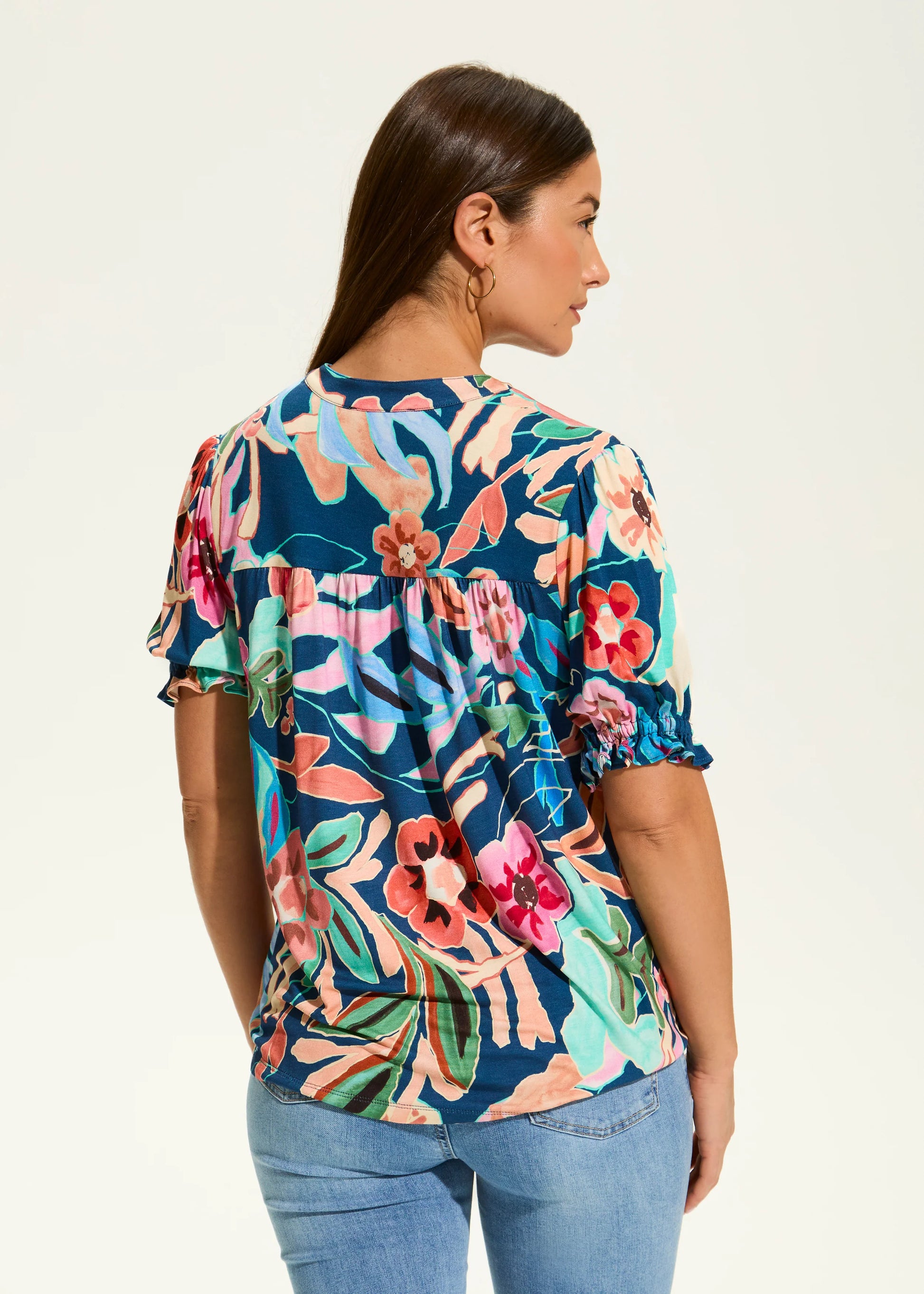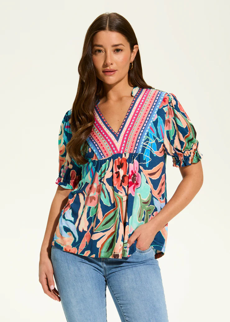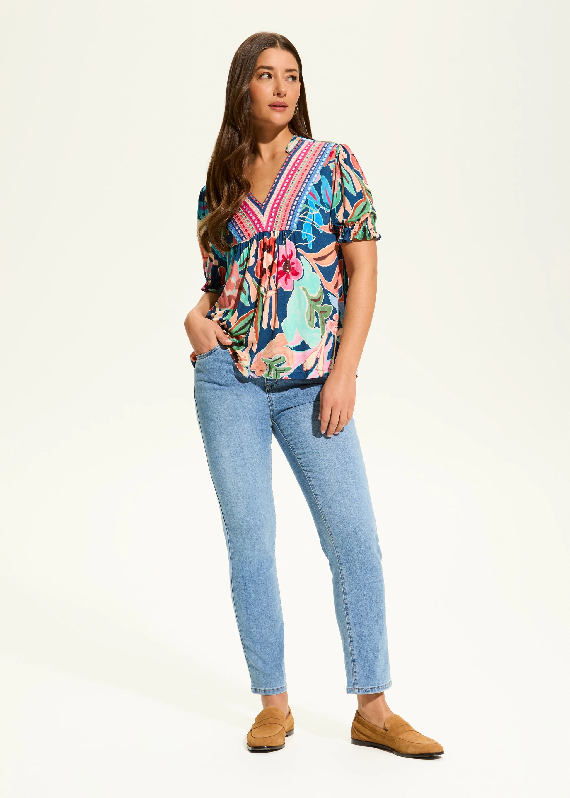 Step into effortless charm with this bohemian-inspired floral blouse. The FDJ Elbow Sleeve Embellished Top features fluttered sleeve cuffs and intricate neckline stitching, blending whimsy with sophistication for a look that’s as versatile as it is beautiful.