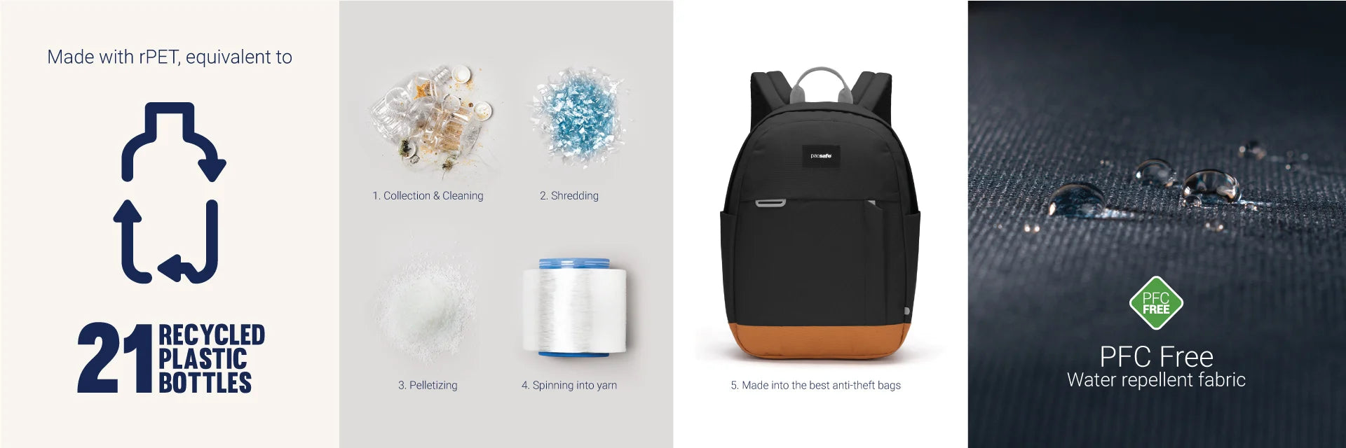 This product is made with post-consumer recycled polyester (rPET), equivalent to 21 recycled plastic bottles, and is treated with a 100% PFC-free water repellency.