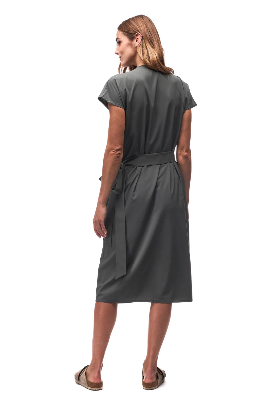 Made from a blend of 88% polyester and 12% spandex (92g/m²), the dress includes refined details such as a wrap neckline, short sleeves, a tied waist belt, and laser‑cut, bonded‑finish pockets. With a front and back length of 44" (size S), it offers balanced coverage and a clean, modern profile. The fabric meets both GRS (Global Recycled Standard) and OEKO‑TEX® certifications, ensuring responsible sourcing and skin‑safe materials. UPF 30+ protection adds another layer of practicality for sunny days and outdoor adventures.