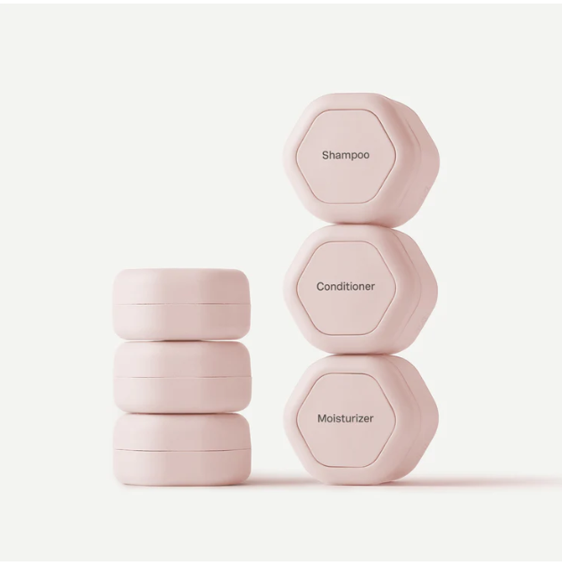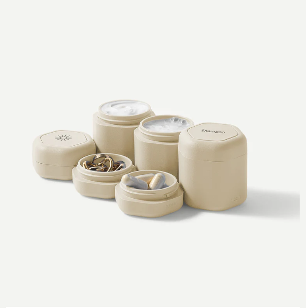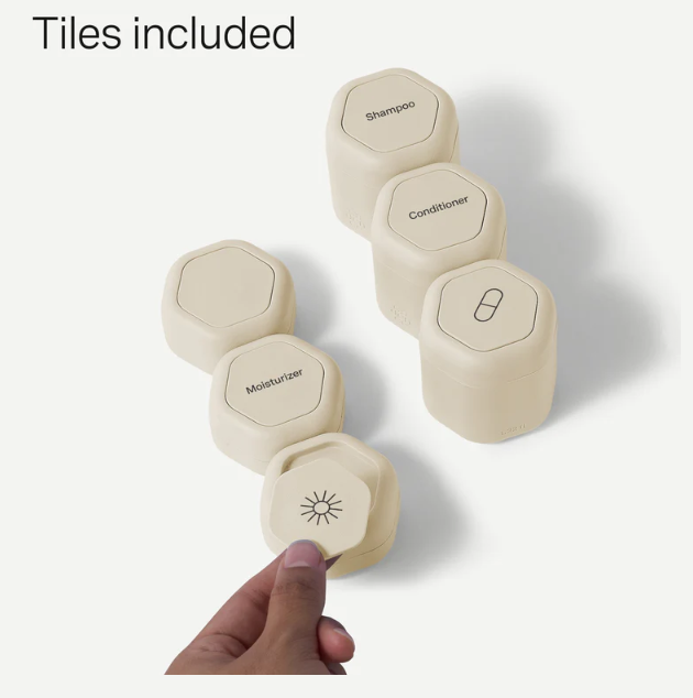 The Cadence Starter Set is an easy, intuitive way to begin building a modular system for travel and everyday organization. It includes three Flex Medium Capsules and three Flex Small Capsules, each paired with magnetic Tiles labeled Shampoo, Conditioner, Moisturizer, a Sun icon, a Pill icon, and a blank Tile for custom use.
