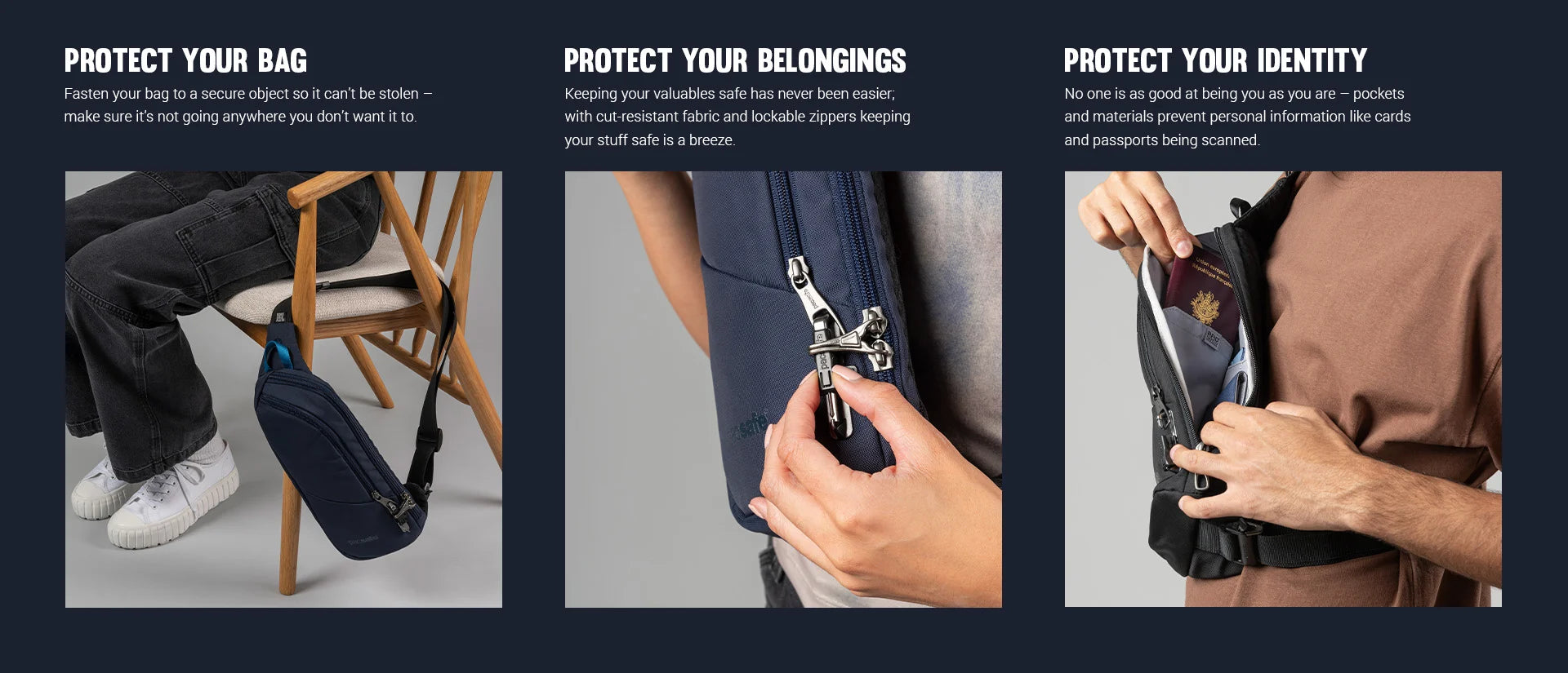 - Cut-resistant anchor strap locks around a fixed object to protect your bag